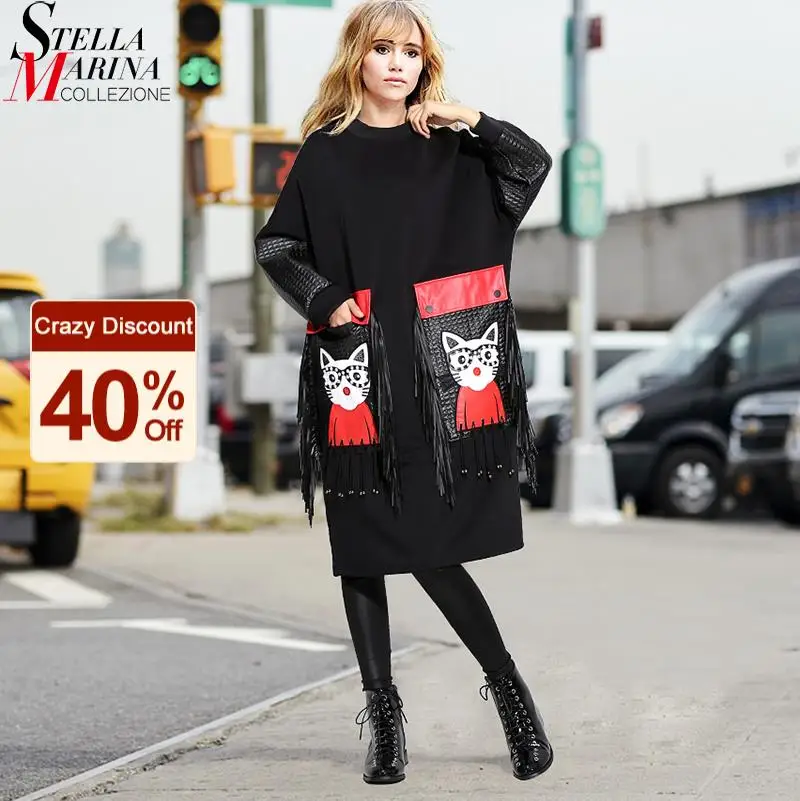 Best Dress from stella marina collezione Official Store for Black Dress Robe Fringes Long-Sleeve 3084 Midi Plus-Size Woman Winter Cute PU Cartoon